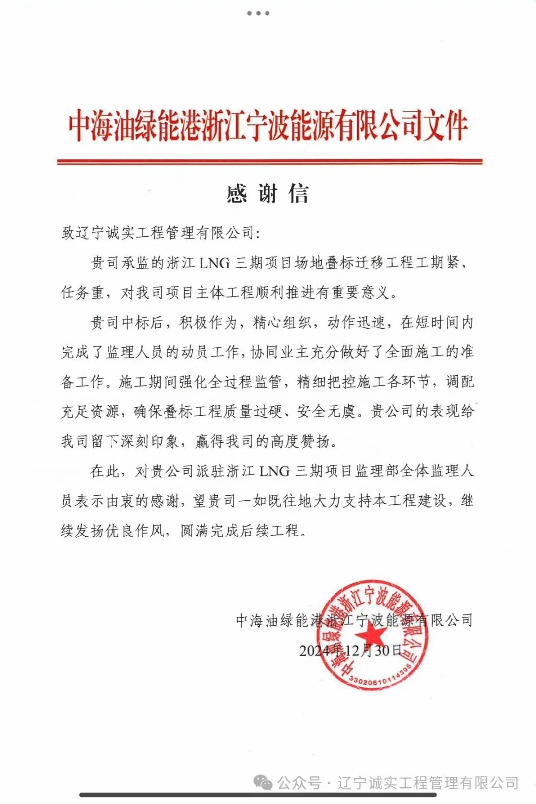 至此2025元旦來臨之際,浙江LNG三期項(xiàng)目場地疊標(biāo)遷移項(xiàng)目部收獲來自于中海油綠能港浙江寧波能源有限公司發(fā)來的一封感謝信。